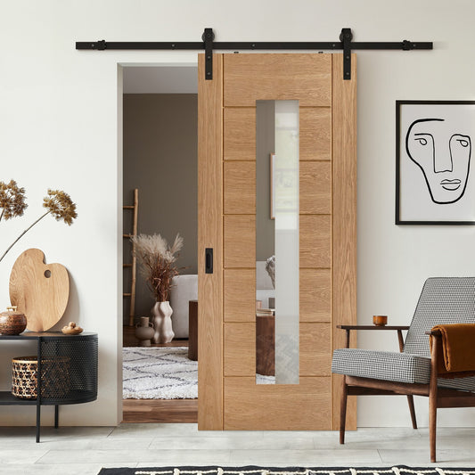 Your price: Regular price £299.00Your price: Sale price £299.00Regular price£299.00Click & Collect Price: £254.15Unit price / perVendor:Liberty DoorsOak Internal Fully Finished Pedrena 1 Light Clear Glass Sliding Door - Black Top Mounted (120744)