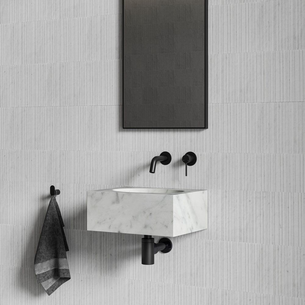 Nosa marble wall hung basin in polished black Carrara marble delivers a compact 400mm solution for trade washroom installs. Horizon Carrara Marble Wall Hung Basin 400mm uses dense marble for long-term durability, stain resistance, and a premium finish suited to high-traffic settings. Wall-hung format improves floor access and speeds first fix, with a support bracket included for secure mounting to solid substrates. Supplied with a 63mm diameter waste cover for a clean outlet finish, compatible with standard UK traps, wastes, and common hand tools. Exclusive trade benefits available to members.
